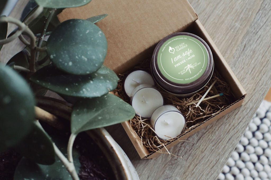 Our shop includes unique affirmation soy candles, and a monthly subscription box. If you are looking for the real deal of small batch candles + woman-owned you've found it! Thank you for visiting the site and supporting our craft & mission.